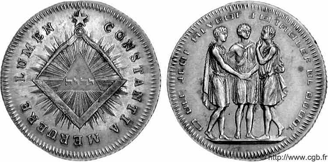 R/ Légende en alphabet maçonnique ([Loge] des amis réunis à l'Orient de Lille). Trois jeunes éphèbes formant la chaîne d'union ou faisant le signe de reconnaissance et portant la main à sa bouche pour indiquer le secret. (cliquer sur l'image pour voir les deux faces).